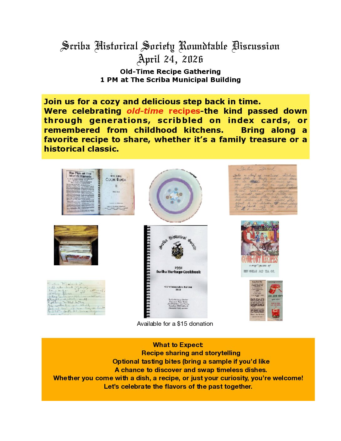 The Scriba Historical Society generally hosts two events per month: a Tuesday evening presentation centering on a Scriba-themed topic, and a Friday afternoon roundtable discussion, where the public is invited to come and share their interest in local and family history, as well as to seek answers to any research they may be doing. Our goal is to be able to pass our heritage down to the coming generations.